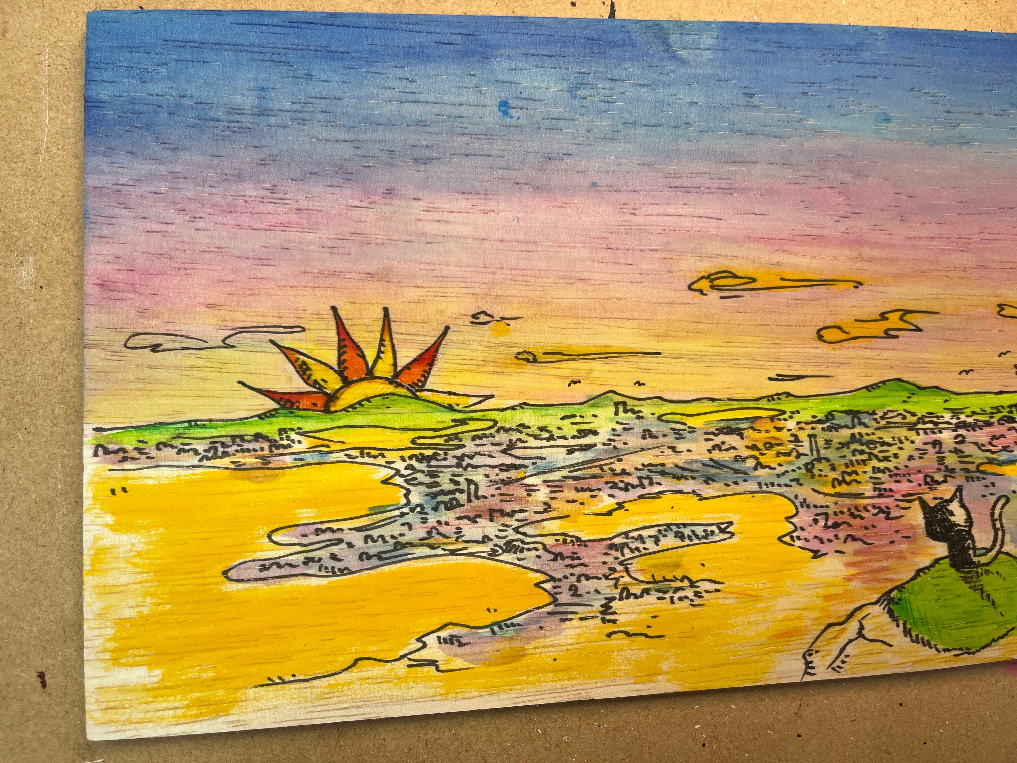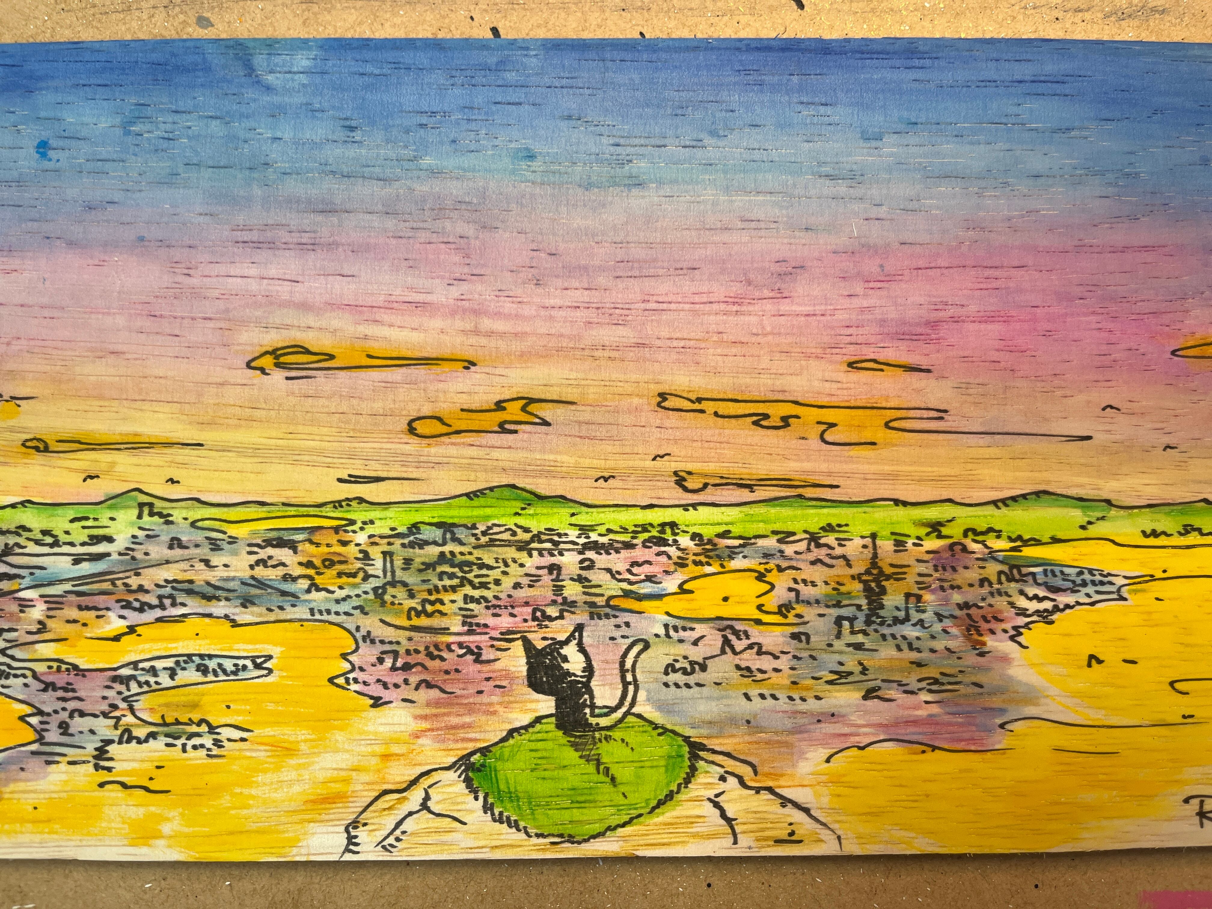架空の街Rockin' Samurai Cityの様々な街や場所にネコが行きその風景を一緒に眺める『ネコの観る風景のシリーズ』より。