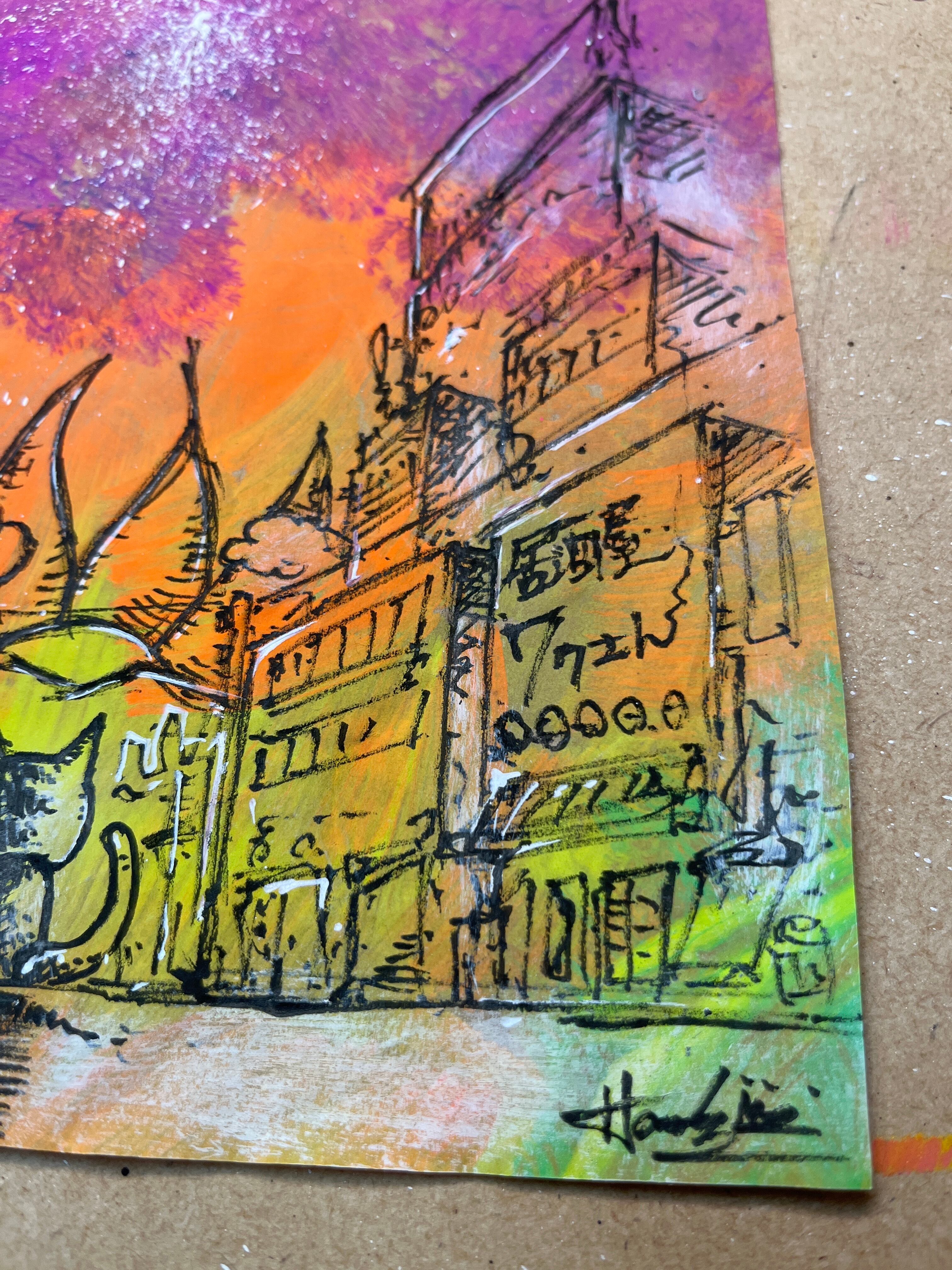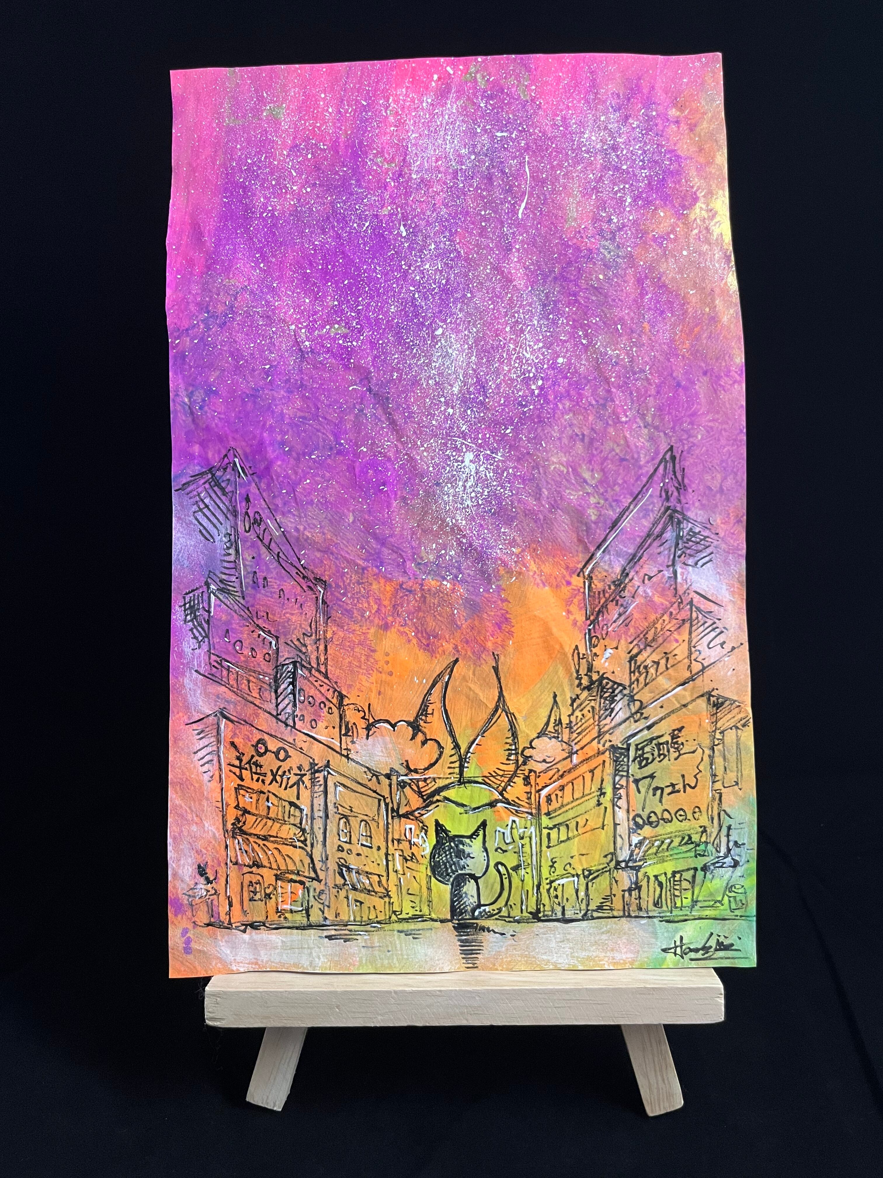 架空の街Rockin' Samurai Cityの様々な街や場所にネコが行きその風景を一緒に眺める『ネコの観る風景のシリーズ』より。