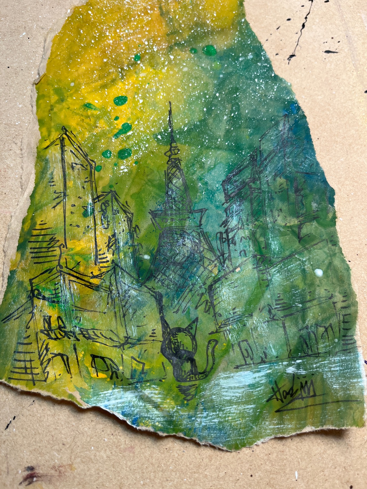 紙、紙用サインペン、水彩絵の具、アクリル絵の具