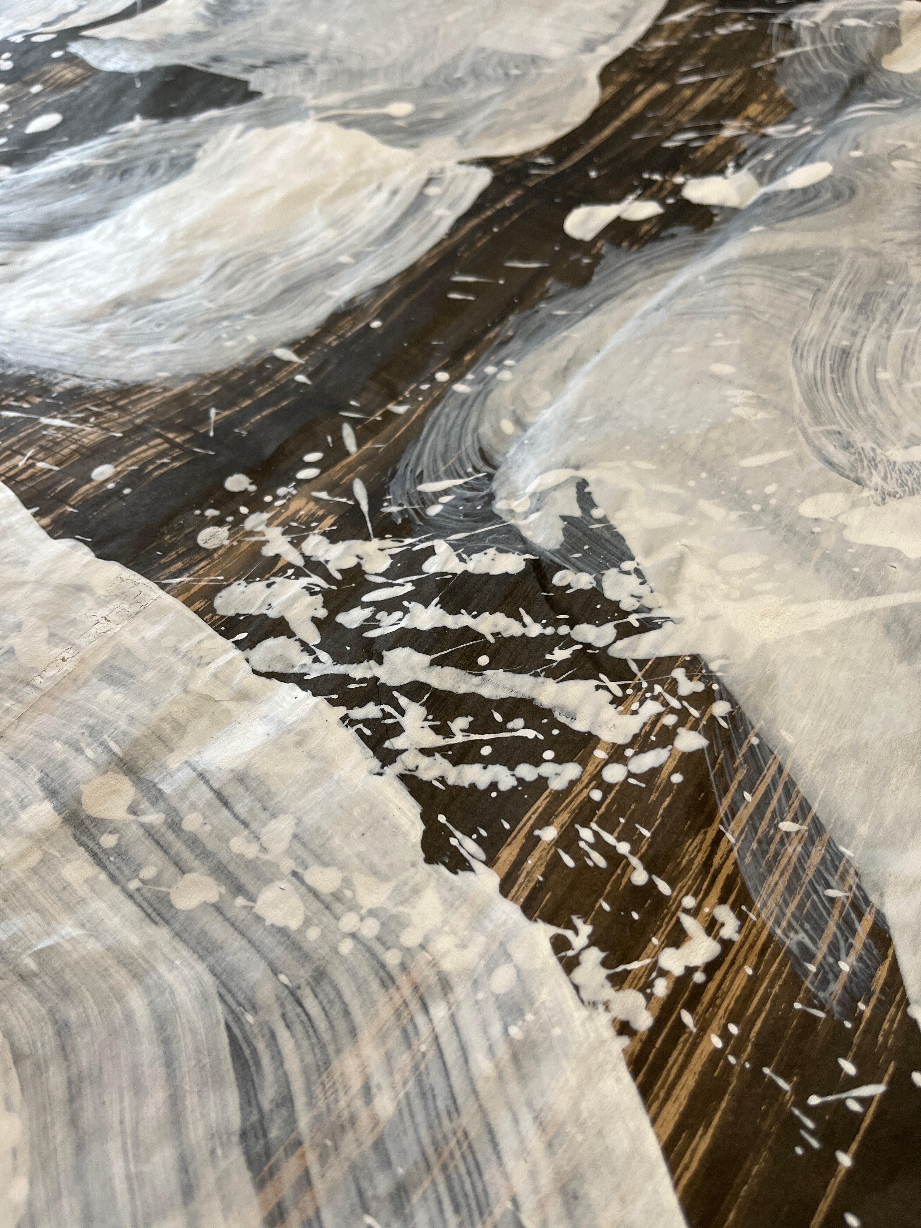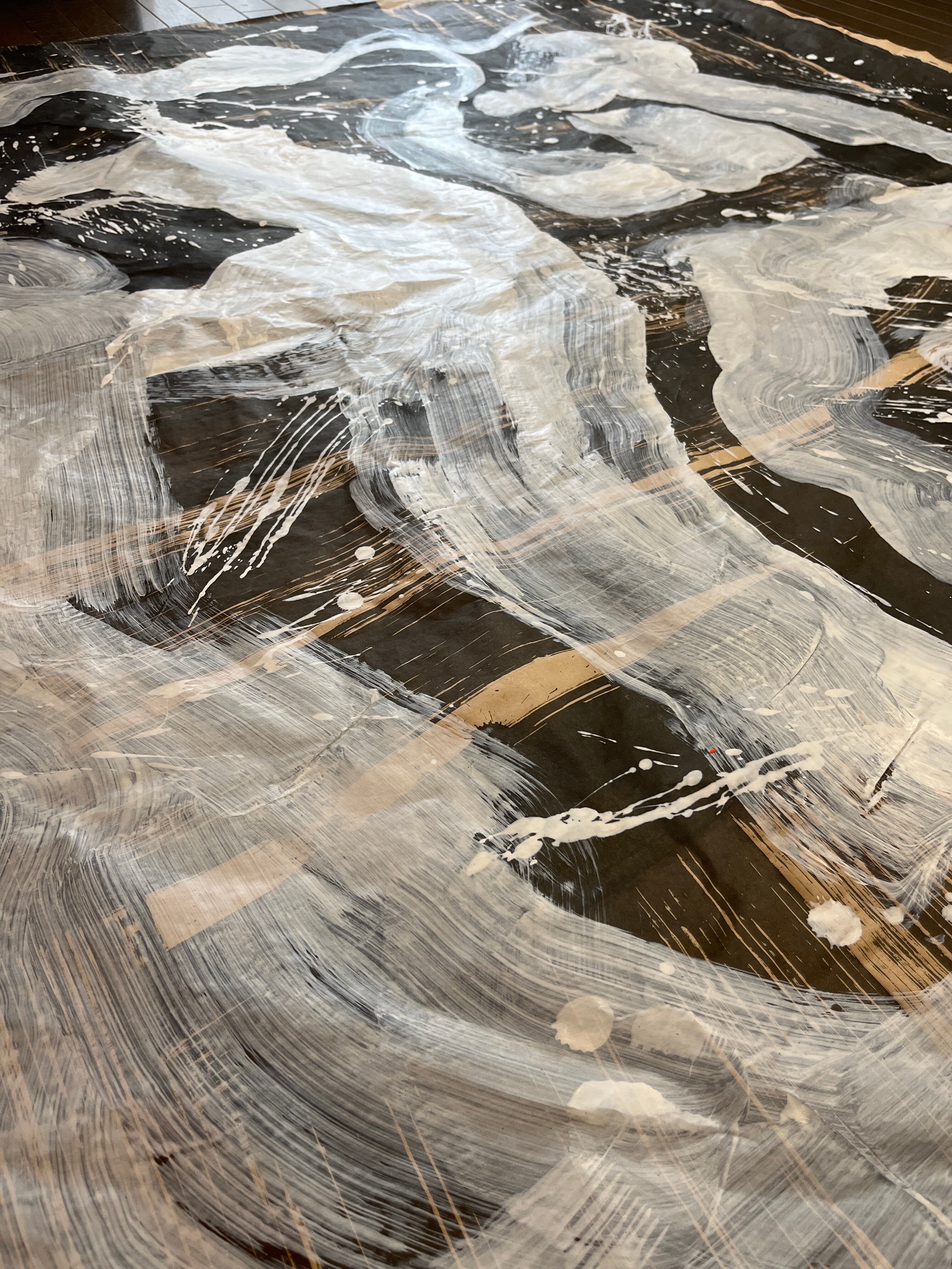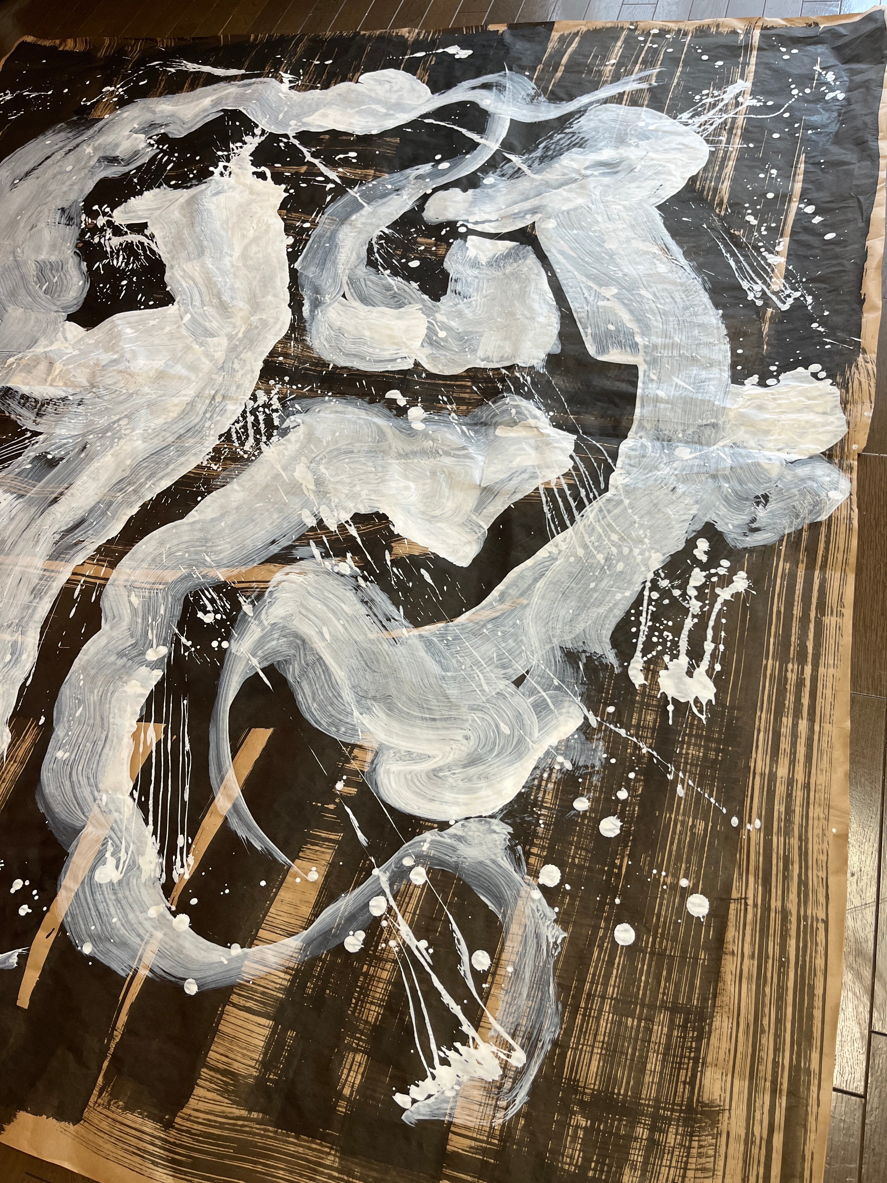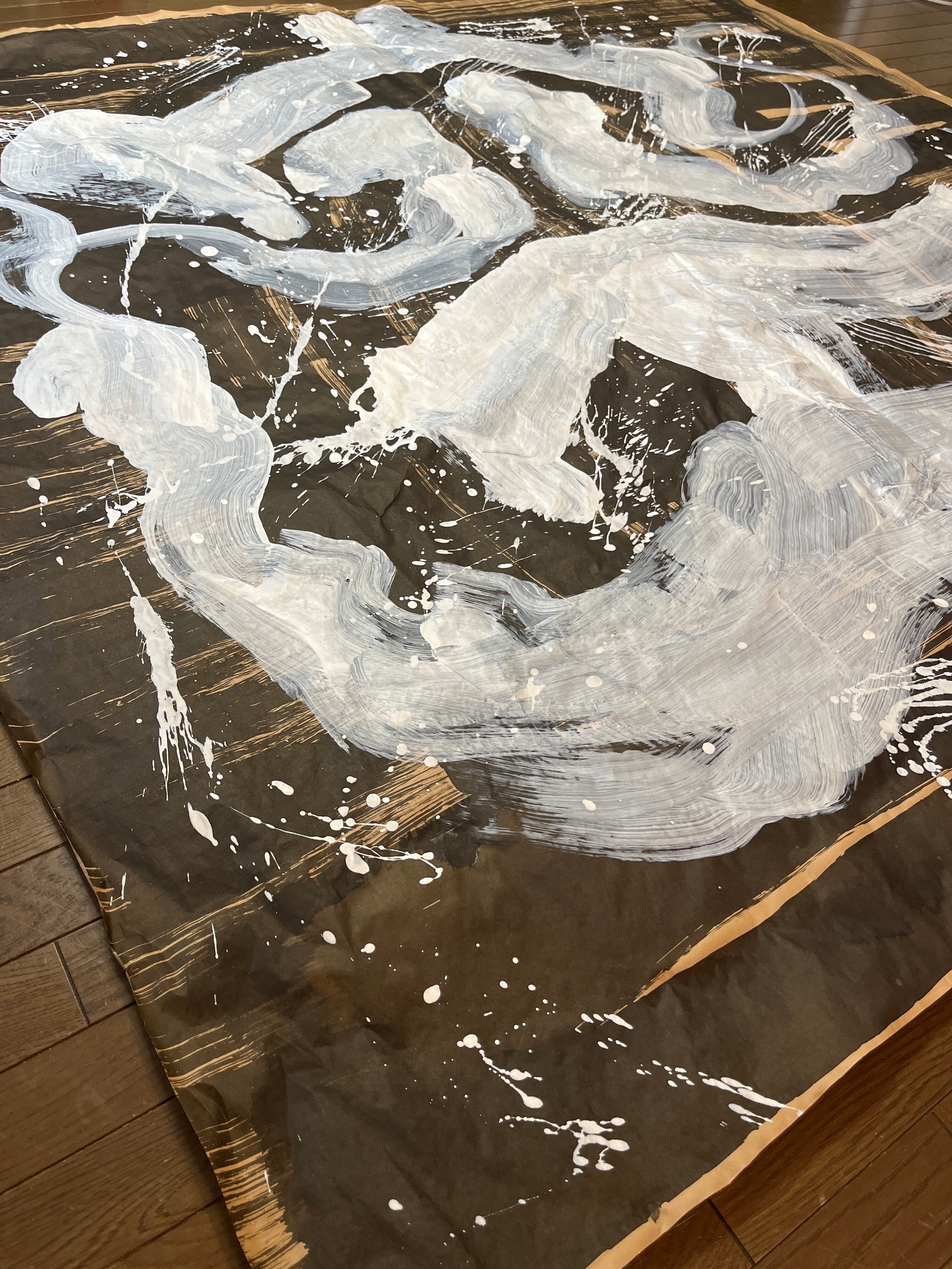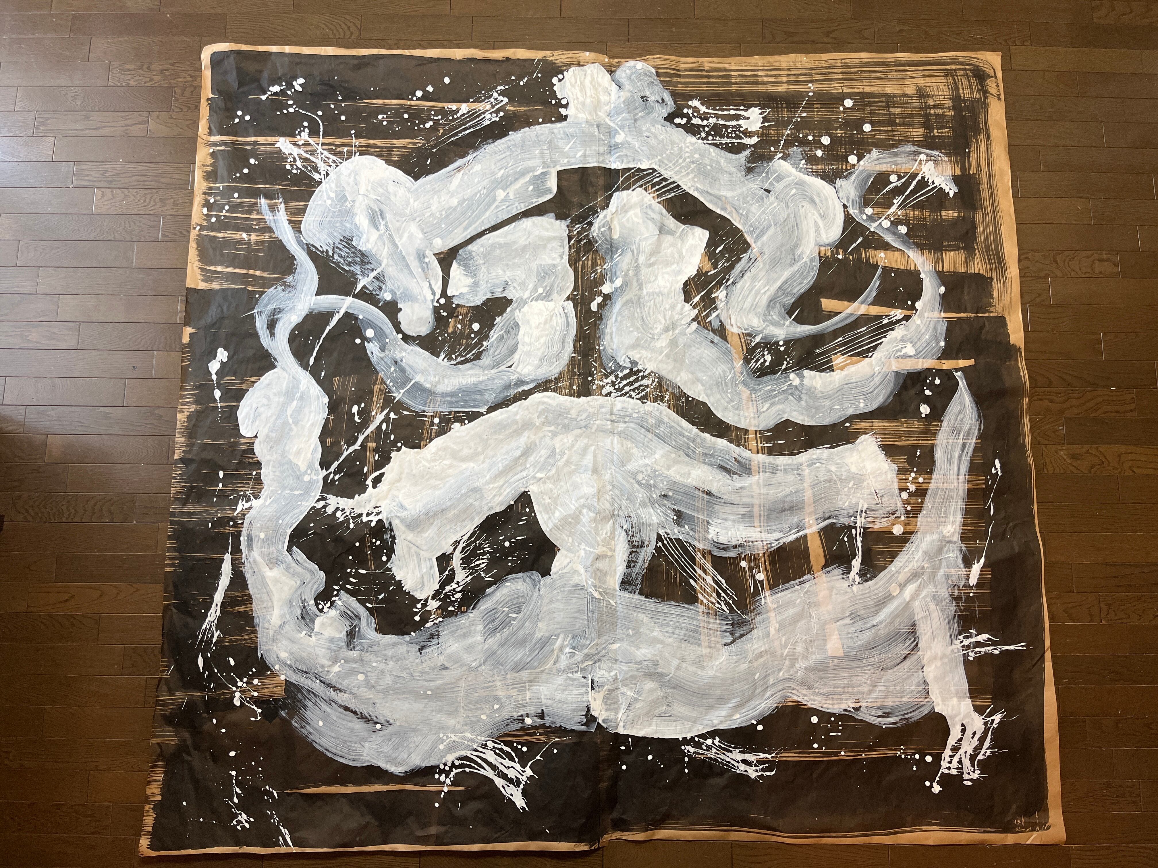 頭にあるビジョンを今までに描いた絵の技法と様々な画材で表現し、そこに今ある想いを融合して奏でた抽象画。