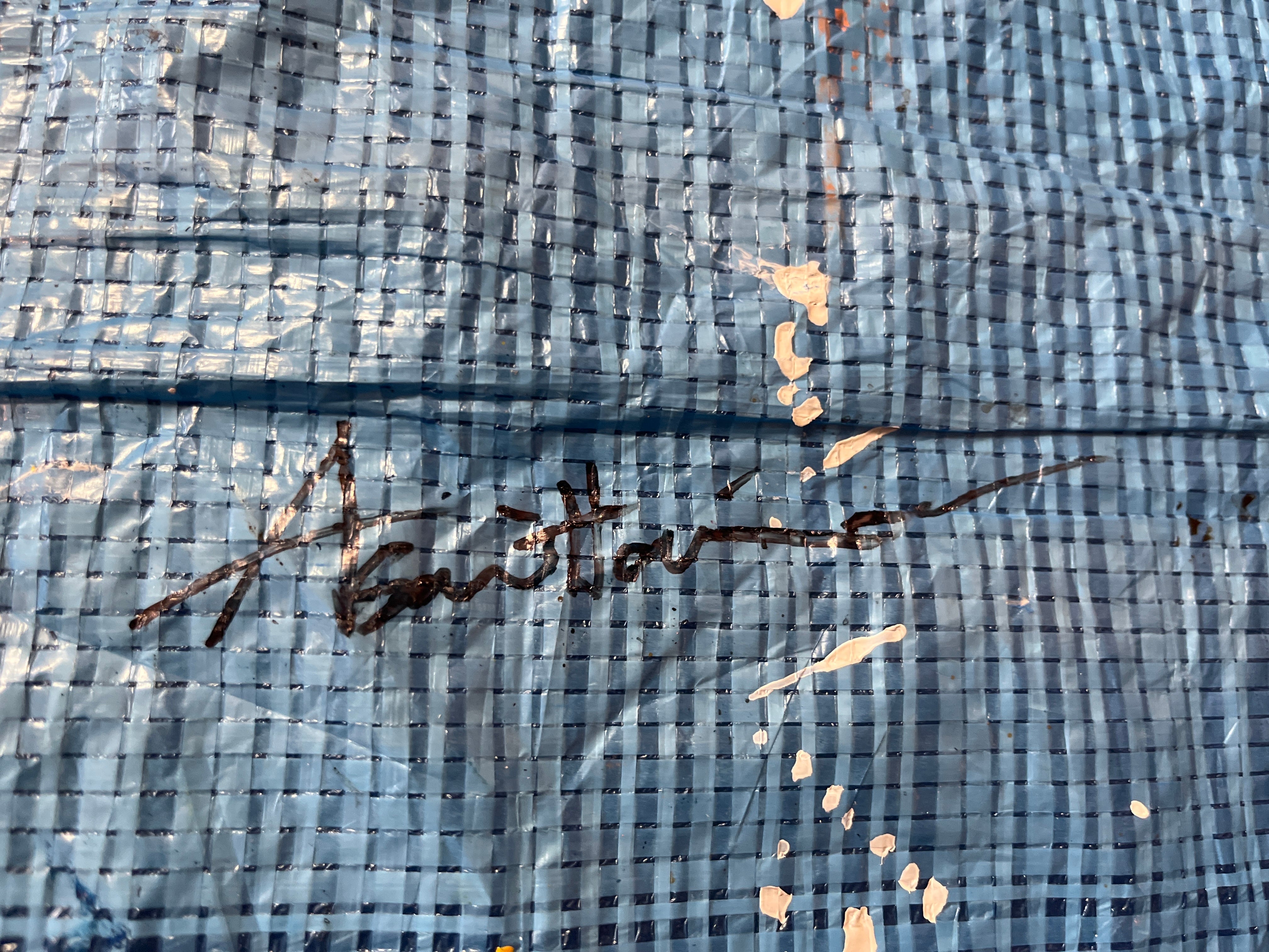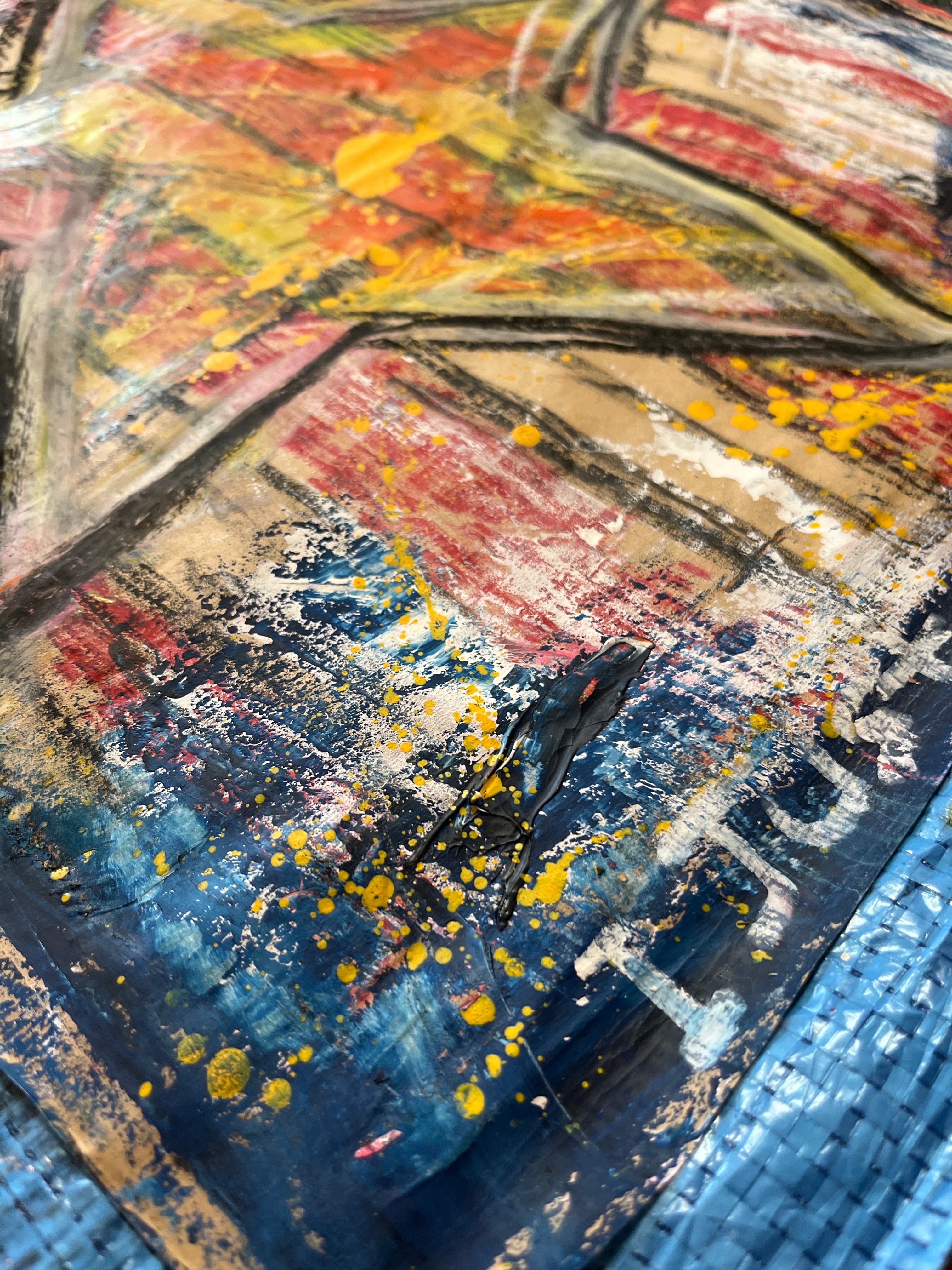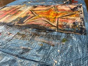 頭にあるビジョンを今までに描いた絵の技法と様々な画材で表現し、そこに今ある想いを融合して奏でた抽象画。