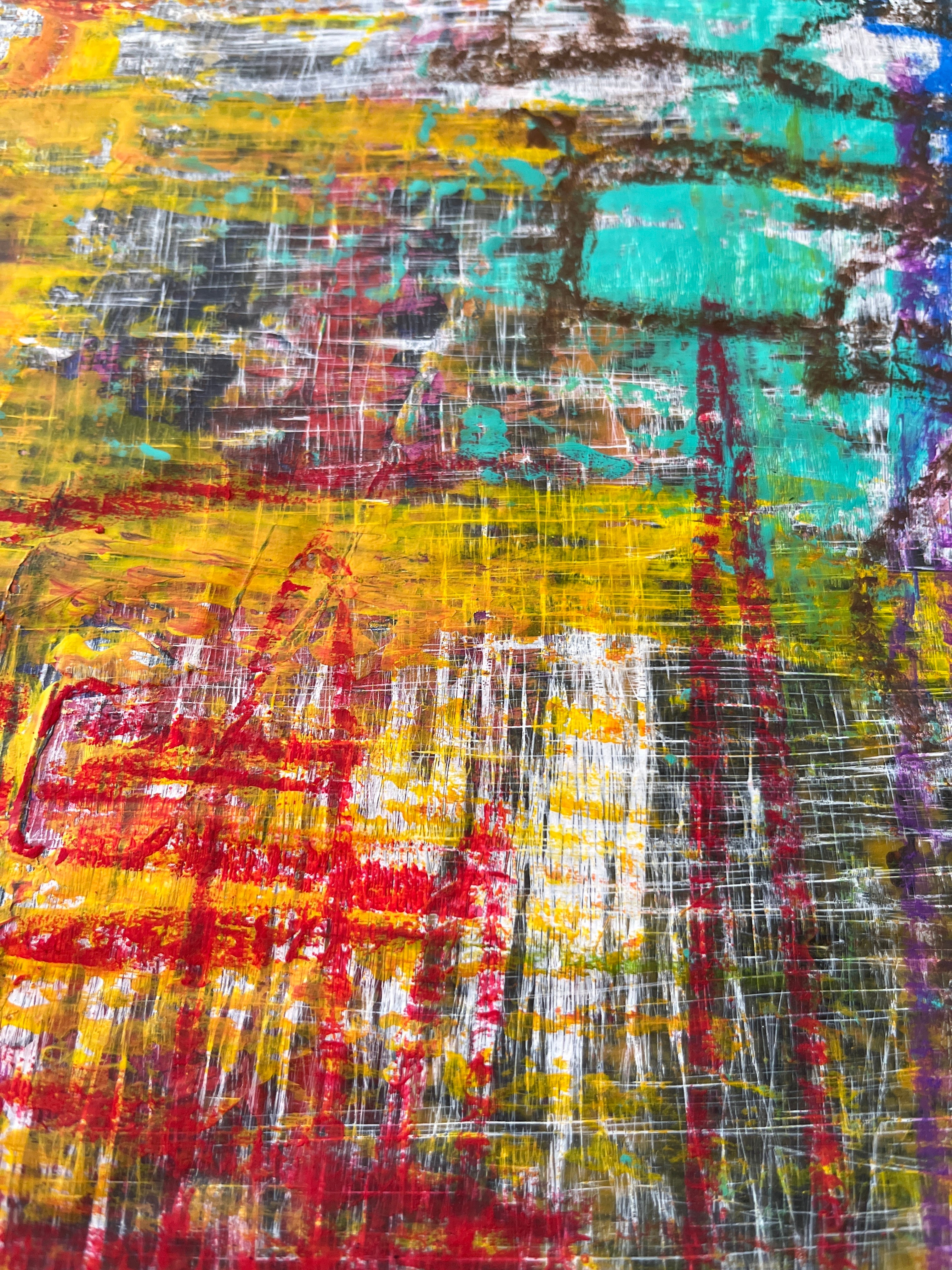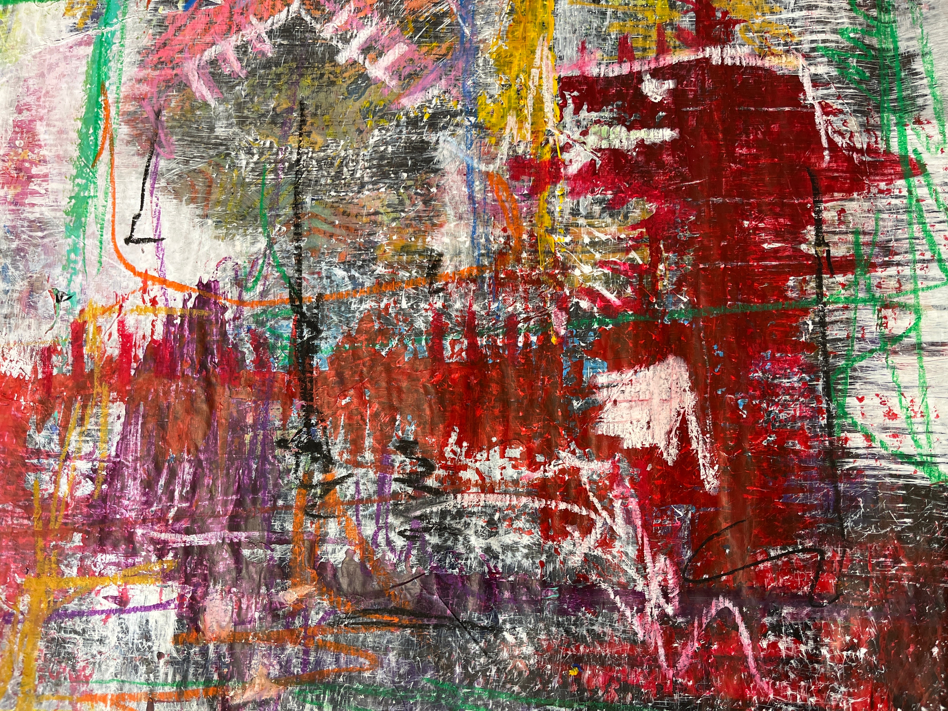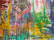 頭にあるビジョンを今までに描いた絵の技法と様々な画材で表現し、そこに今ある想いを融合して奏でた抽象画。